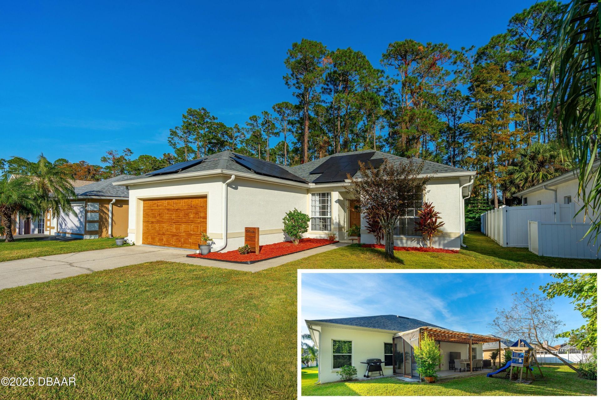4 BEDROOM | NO REAR NEIGHBORS | SOLAR PAID OFF | LOWER MONTHLY COST! Most 4 bedroom homes in Port Orange don't just cost more upfront, they cost more every single month. This one is different. Located in Forest Lakes Preserve, this 4 bed, 2 bath home offers no rear neighbors and a private backyard backing to conservation. Solar will be paid off at closing, keeping electric bills extremely low (around $67/month average). It also features a rare 3 percent assumable FHA mortgage with an approximate $209k balance, creating a significantly lower monthly payment than most homes in today's market. Inside you'll find vaulted ceilings, open layout, split bedrooms, and a screened lanai, plus major updates including roof (2022) and HVAC (2019). Seller may offer closing cost assistance with acceptable offer. Low HOA and move-in ready. When you compare total monthly cost, privacy, and financing advantage, this home stands out among 4 bedroom homes in 32128. The eat-in kitchen offers generous cabinetry, breakfast bar seating, and open sight lines into the main living space -- ideal for entertaining, remote work, or everyday life.Strategic Upgrades & Features:- 30 Solar Panels (2022) - avg. 1.22 MWh/month production- New Roof (2022)- HVAC (2019)- Wrap-Around Gutters (2022)- Screened Lanai overlooking preserve- Indoor Laundry Room- Two-Car GarageEnergy efficiency, conservation backing, and proximity to top-rated schools, parks, and major commuter routes make this home a smart long-term investment in Port Orange real estate.Homes in Forest Lake Preserve with permanent preserve views and established solar infrastructure rarely come available.Schedule your private showing and experience the difference thoughtful upgrades and true backyard privacy make.